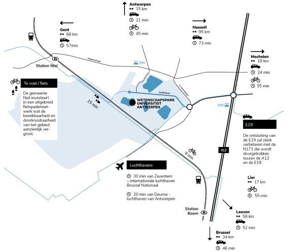 The Science Park is centrally located between Antwerp and Brussels, easily accessible and just outside the congestion-prone periphery around those cities. The park is easy to reach by car: you are immediately on the A12 and the connection with the E19 is in the works.